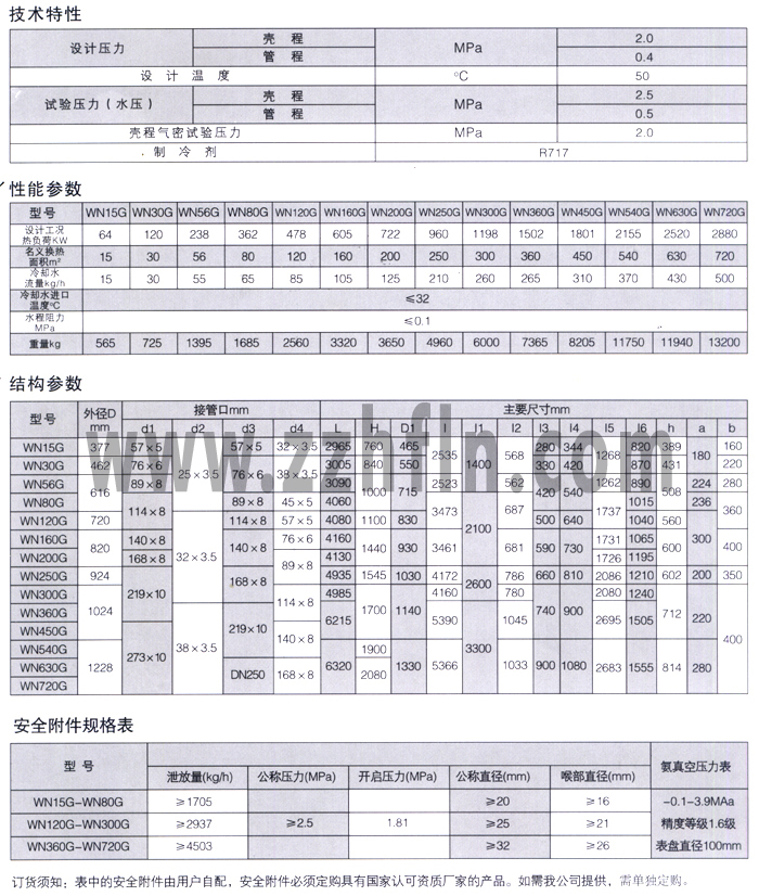 WNG系列冷凝器 WNG系列冷凝器為臥式殼管式結(jié)構(gòu)。其換熱管采用高效的螺旋槽管,換熱效果高。工作時高溫高壓過熱蒸氣由殼體的頂部進汽管進入殼體與管束間的空隙,與管程的冷卻水進行換熱,在管子外表面冷凝成液體后由殼體下部出液管引出。冷卻水從瑞蓋下部進水管進入冷凝器,由于端蓋上分水筋的作用,使冷卻水在筒體內(nèi)分成數(shù)個流程并按順序流動,最后經(jīng)端蓋上部的出水管排出。