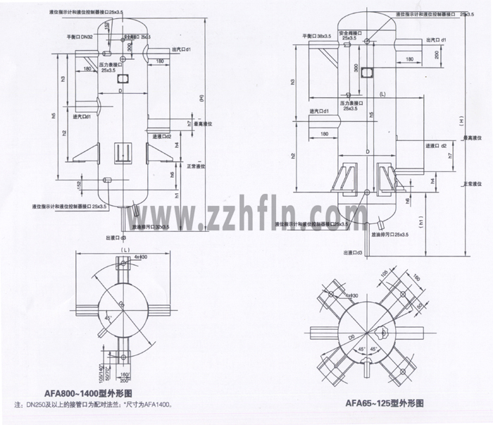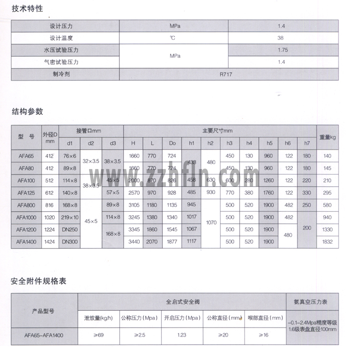 AFA系列氨液分離器為立式結構,從蒸發(fā)器來得氨氣從設備中部的進氣管進入,分離液滿后從設備上部的出氣管被壓縮機吸走。