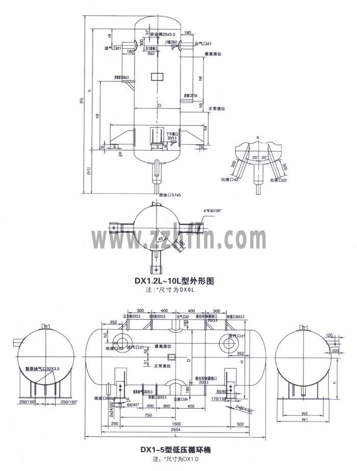 DX-L系列低壓循環(huán)桶為立式結(jié)構(gòu),蒸發(fā)器來(lái)的氨氣從設(shè)備上部的進(jìn)氣管進(jìn)入,分離液體后同節(jié)流后的閃發(fā)氣體上部的出氣管被壓縮機(jī)吸走,分離下來(lái)的氨液和高壓節(jié)流后的低壓氨液從下部出液管供給氨泵。